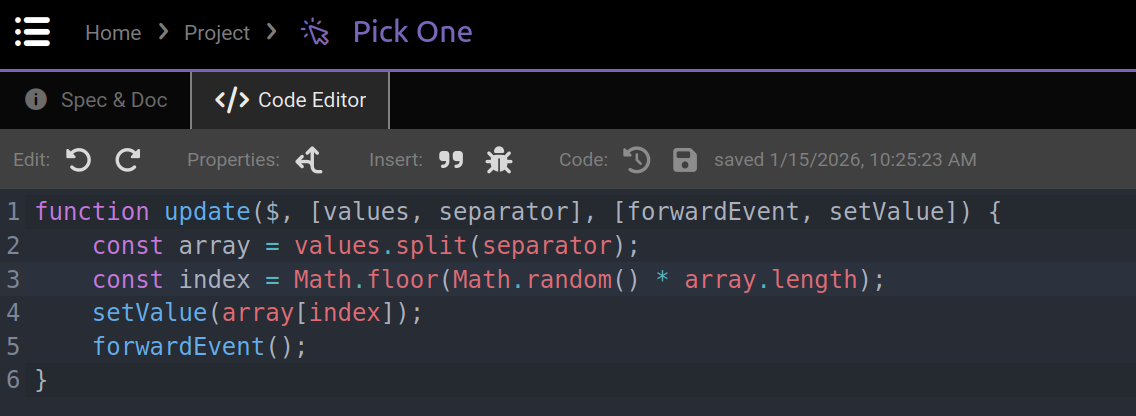 In this new tab you can edit the code directly, note that the function signature must still be done in the Spec & Doc. Once you are happy with the code, just click the save button (or press Ctrl+S) to keep it.